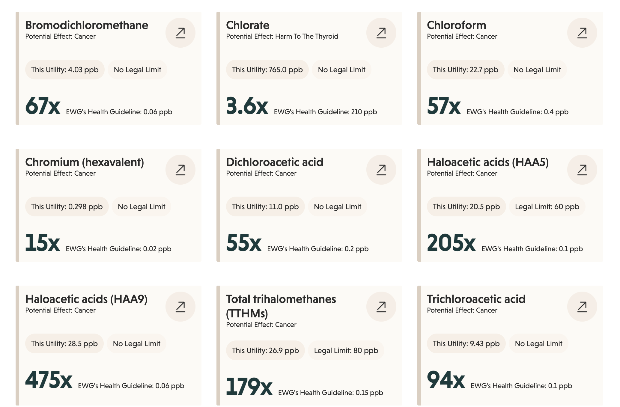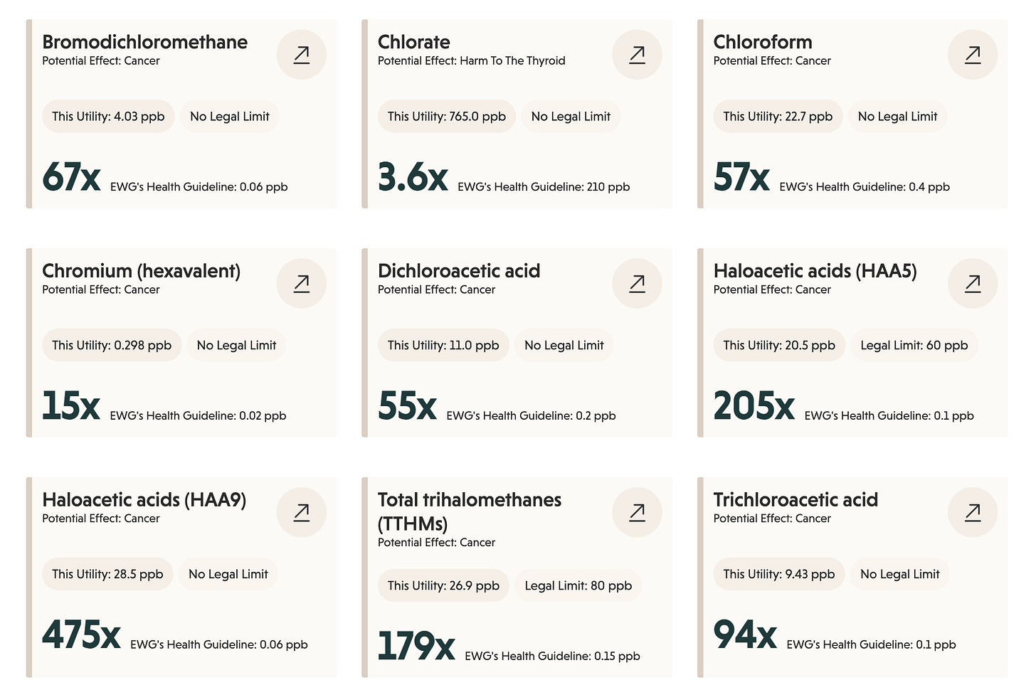 This is exactly what it looks like for a water utility to be in compliance with EPA regulations but providing water that is 179 times greater than health recommendations (see total trihalomethanes above).